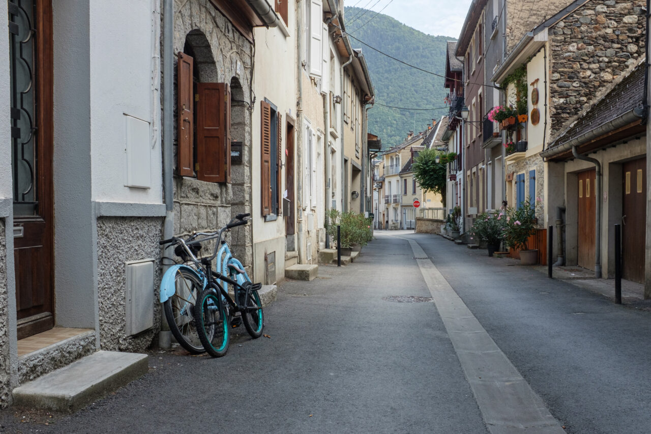 Two small children’s cycles propped against an old stone house in a narrow street in a mountain village, Haute-Garonne, Occitanie, France